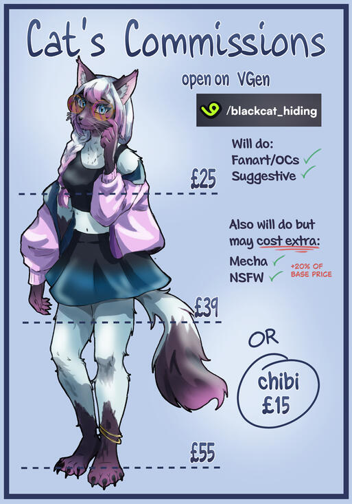 My preferred way of comms is through VGen, but you can also use Artistree or Ko-Fi, if that's what you prefer. All of these support card and paypal payments.